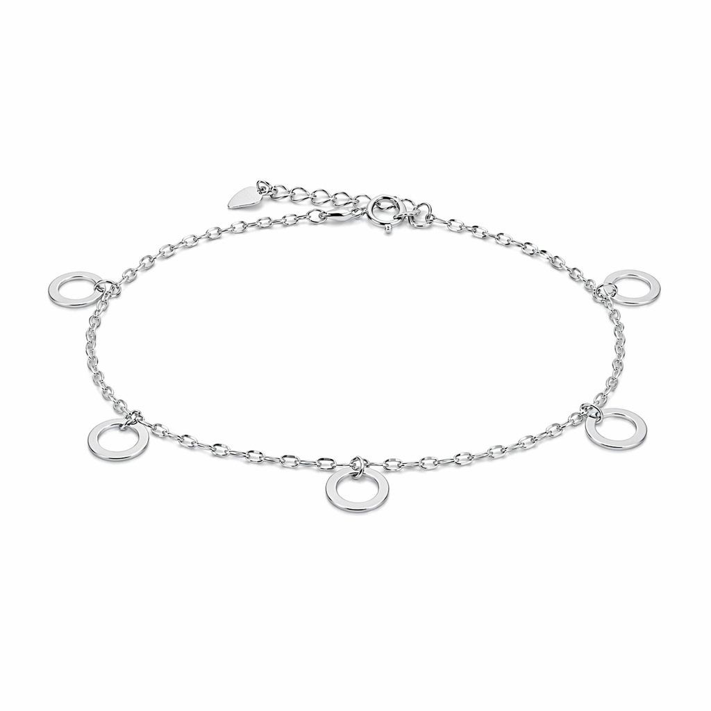 Stříbrný náramek na nohu Luna je poctou jednoduchosti, která nikdy nevyjde z módy. Pět drobných kruhových přívěsků pravidelně rozmístěných na lesklém řetízku vytváří dojem pohybu a lehkosti, zatímco odlesky stříbra dodávají šperku elegantní lesk.