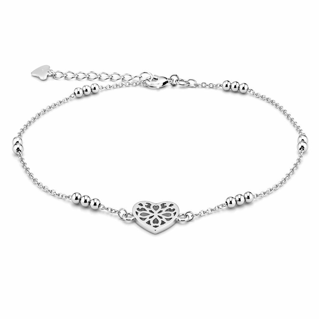 Stříbrný náramek na nohu Mandala v sobě spojuje něžnost, sílu symboliky a elegantní minimalismus. Dominantou šperku je filigránové srdce s motivem mandaly – tradičního symbolu rovnováhy, jednoty a klidu. Drobné hladké kuličky rozmístěné po celé délce řetízku dodávají náramku jemný pohyb a lesk.