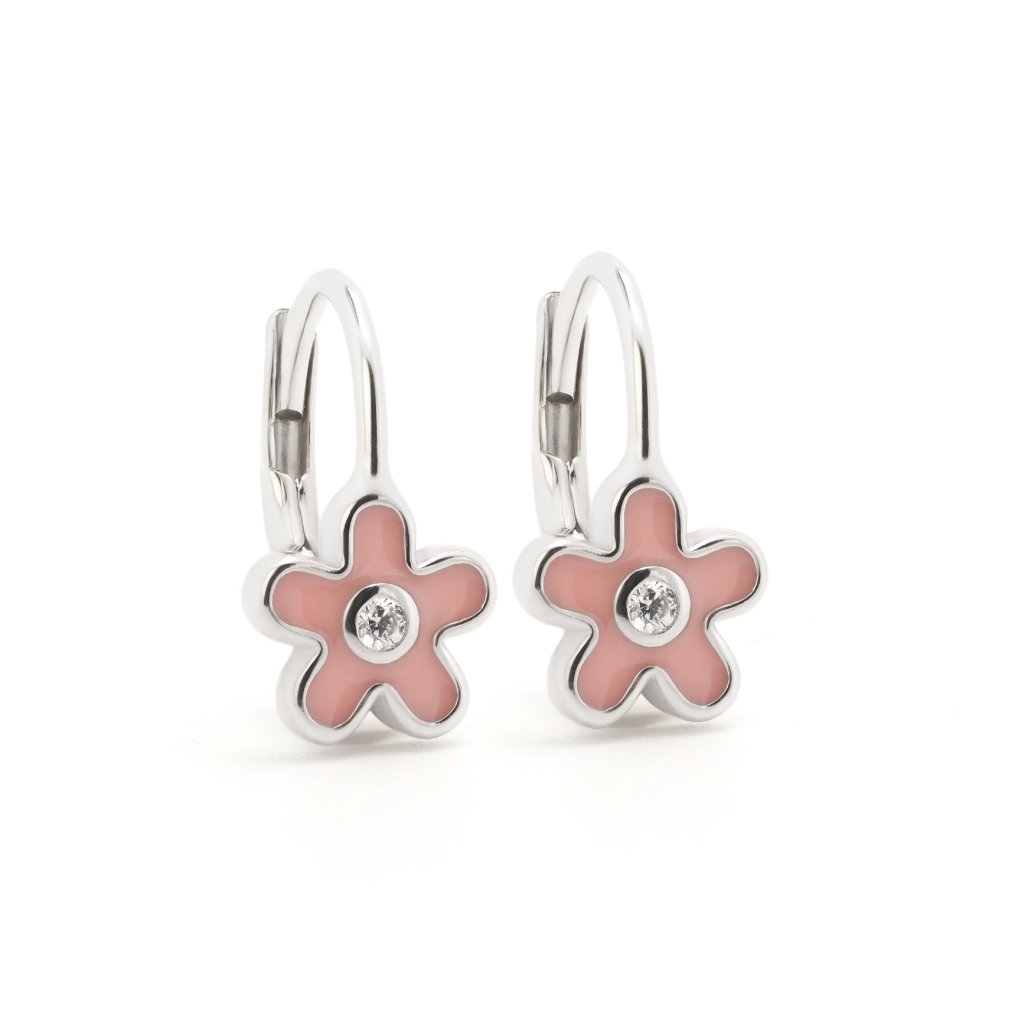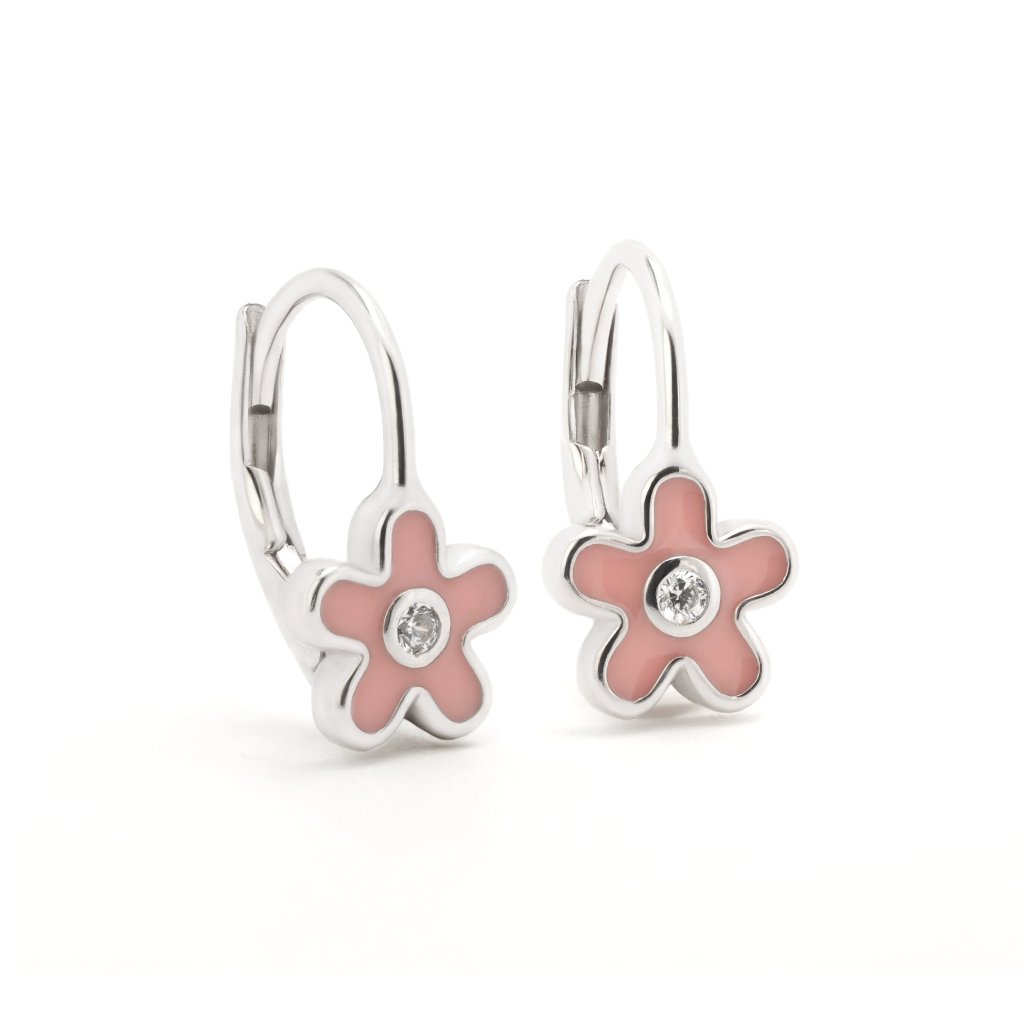 Tyto stříbrné dětské náušnice ve tvaru květinky rozzáří každou malou slečnu. Růžový smalt dodává květům něžný nádech a třpytivý čirý zirkon uprostřed zaujme na první pohled. Díky bezpečnému zapínání typu klapka jsou vhodné i pro každodenní nošení.
