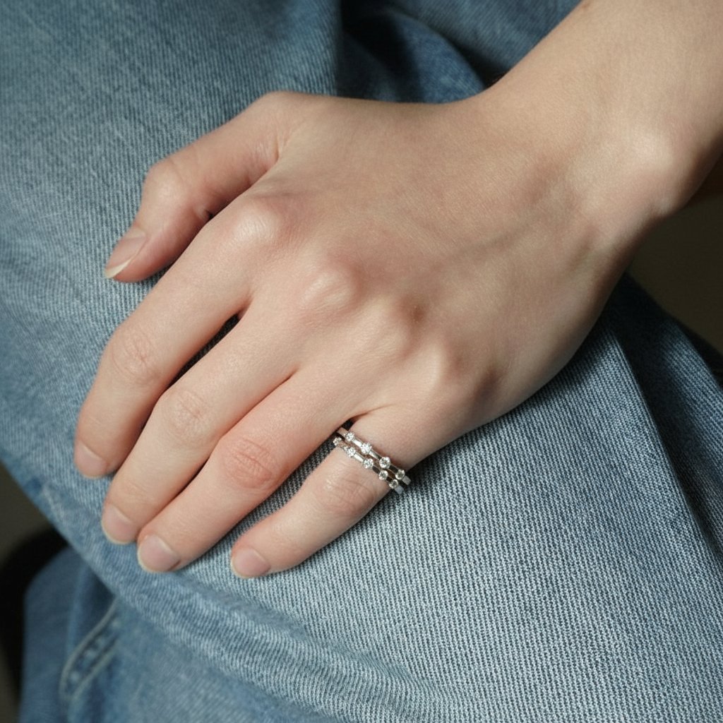Vyrobený z pravého stříbra 925/1000 s rhodiovou úpravou, která chrání proti černání a zajišťuje dlouhotrvající lesk. Díky svému originálnímu designu je skvělou volbou pro vrstvení s dalšími prsteny nebo jako samostatný elegantní šperk.